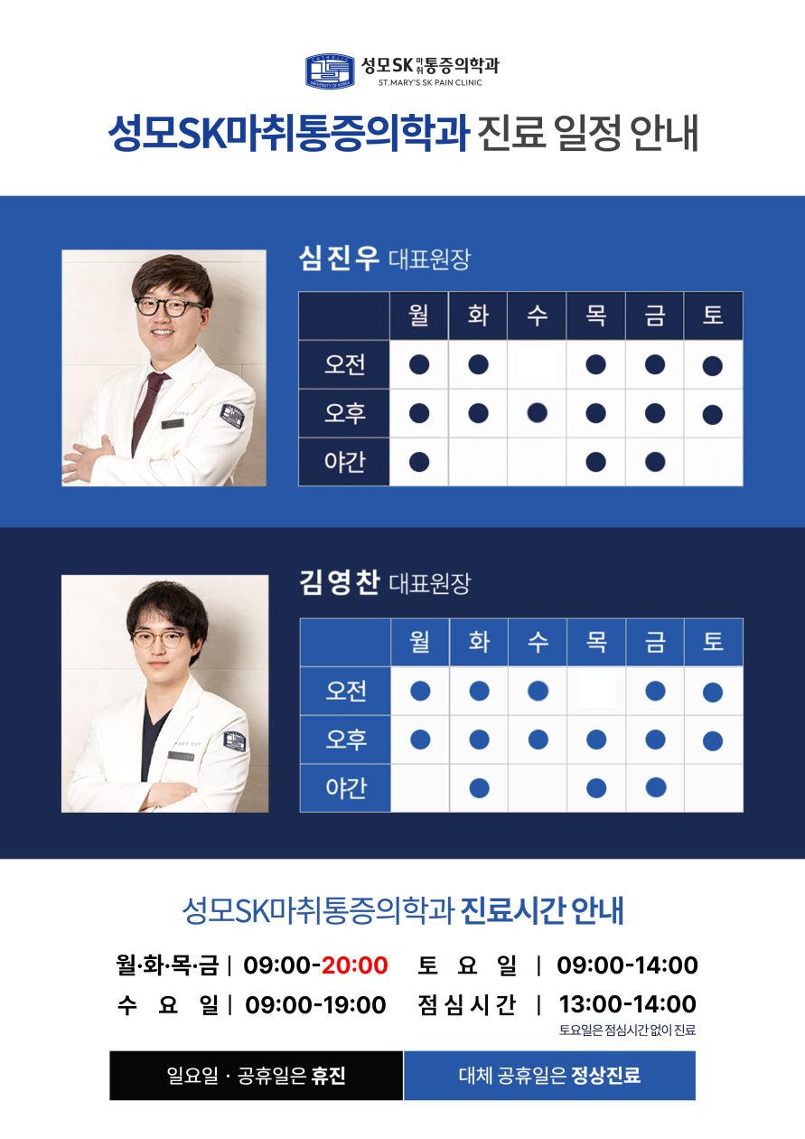 안녕하세요. 성모SK마취통증의학과 대표원장 심진우, 김영찬 입니다.